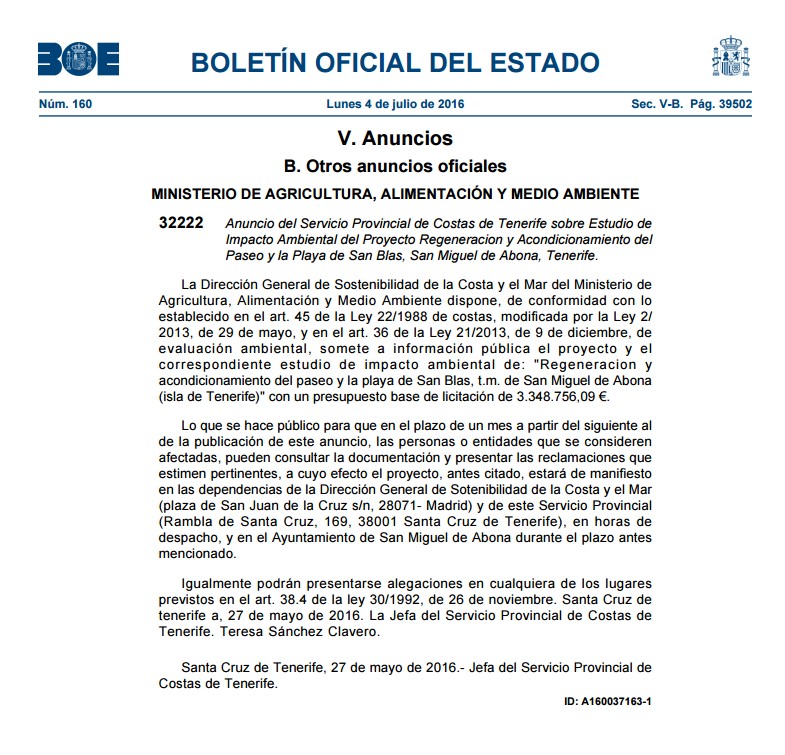 SB-Noticias.- La Dirección General de Sostenibilidad de la Costa y el Mar del Ministerio de Agricultura, Alimentación y Medio Ambiente ha sacado a exposición pública el proyecto y el correspondiente estudio de impacto ambiental de la «Regeneracion y acondicionamiento del paseo y la playa de San Blas, t.m. de San Miguel de Abona (isla de Tenerife)», con un presupuesto base de licitación de 3.348.756,09 €.