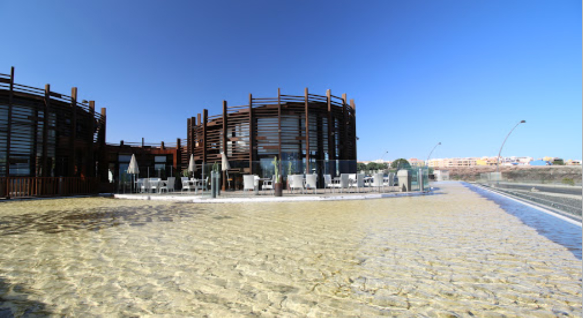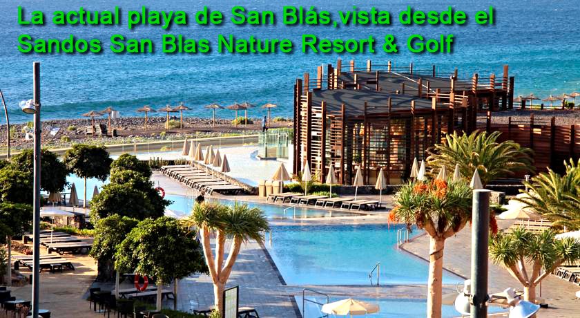 La asignatura pendiente del complejo hotelero Sandos San Blás Nature Resort & Golf es la playa privada, actualmente en su Web publicita una playa virtual, casi metafórica, con arena blanca, justo en el tramo que le falta para llegar a unos metros de la cota de la marea alta, que utiliza a modo de solarium. Sin embargo, la actual playa de San Blas, no reúne el glamour necesario para sus cinco estrellas y sus piedras y callaos no son aptos para los clientes, por lo que en la frontera del solarium se recrea un río artificial y un pretil de unos 20 centímetros de altura separa el complejo hotelero del más que dudoso límite del dominio púbico. Basta ver la foto superior para que surjan dudas de por qué Cho-Vito sí y Sandos San Blás no, y por qué la Dirección General de Costas, con la misma diligencia con que dispuso la demolición de Cho-Vito, construirá una playa ad hoc para la transnacional Sandos, que opera en Mexico y España ¿Se habrán fijado los técnicos de la Dirección General de Costas de la distancia al mar de las construcciones aledañas al «Sandos San Blas Nature Resort & Golf»? ¿Tendrán miopía selectiva? ¿»La voz de Canarias en Madrid» no les ha advertido de esa tropelía contra el territorio guanche?