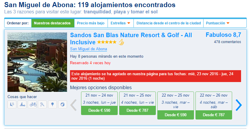La redacción de SB-Noticias intentó sin éxito reservar una habitación durante una noche. Sólo en el mes de noviembre nos da la posibilidad de alojarnos durante un periodo entre 3 y 4 noches (mínimo) con precios entre 590 y 787€, sólo alojamiento.