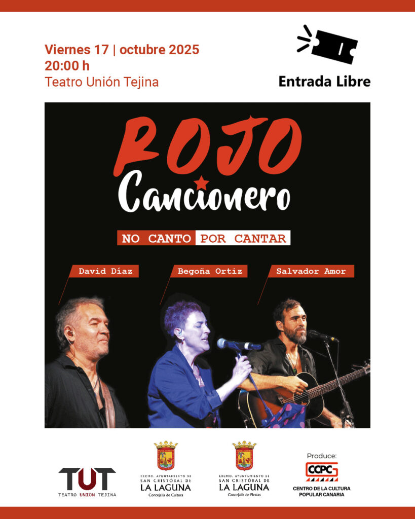 Rojo Cancionero presenta su espectáculo No Canto por Cantar el jueves día 17 de octubre, a las 20:00h., en el Teatro Unión Tejina (Tejina-La Laguna). La entrada al evento será gratuita.