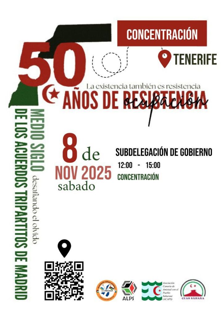 Este sábado a partir de las 12h., numerosos colectivos en apoyo a la causa saharaui convocan una Concentración en Santa Cruz de Tenerife frente a la Subdelegación del Gobierno, con motivo de cumplirse 50 años de los acuerdos de Madrid.